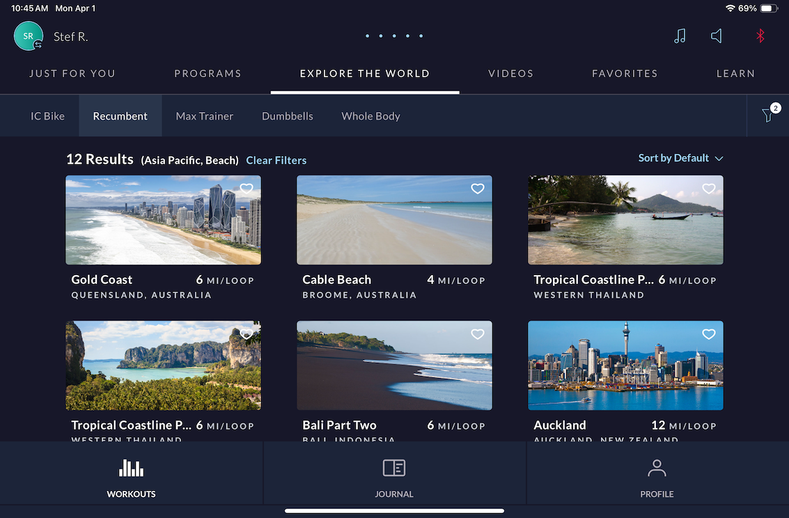 Explore The World routes can be selected from the Just For You and Explore The World Workouts tabs. Routes can also be chosen in the Entertainment Options screen after the workout is selected (tap See All for more routes).